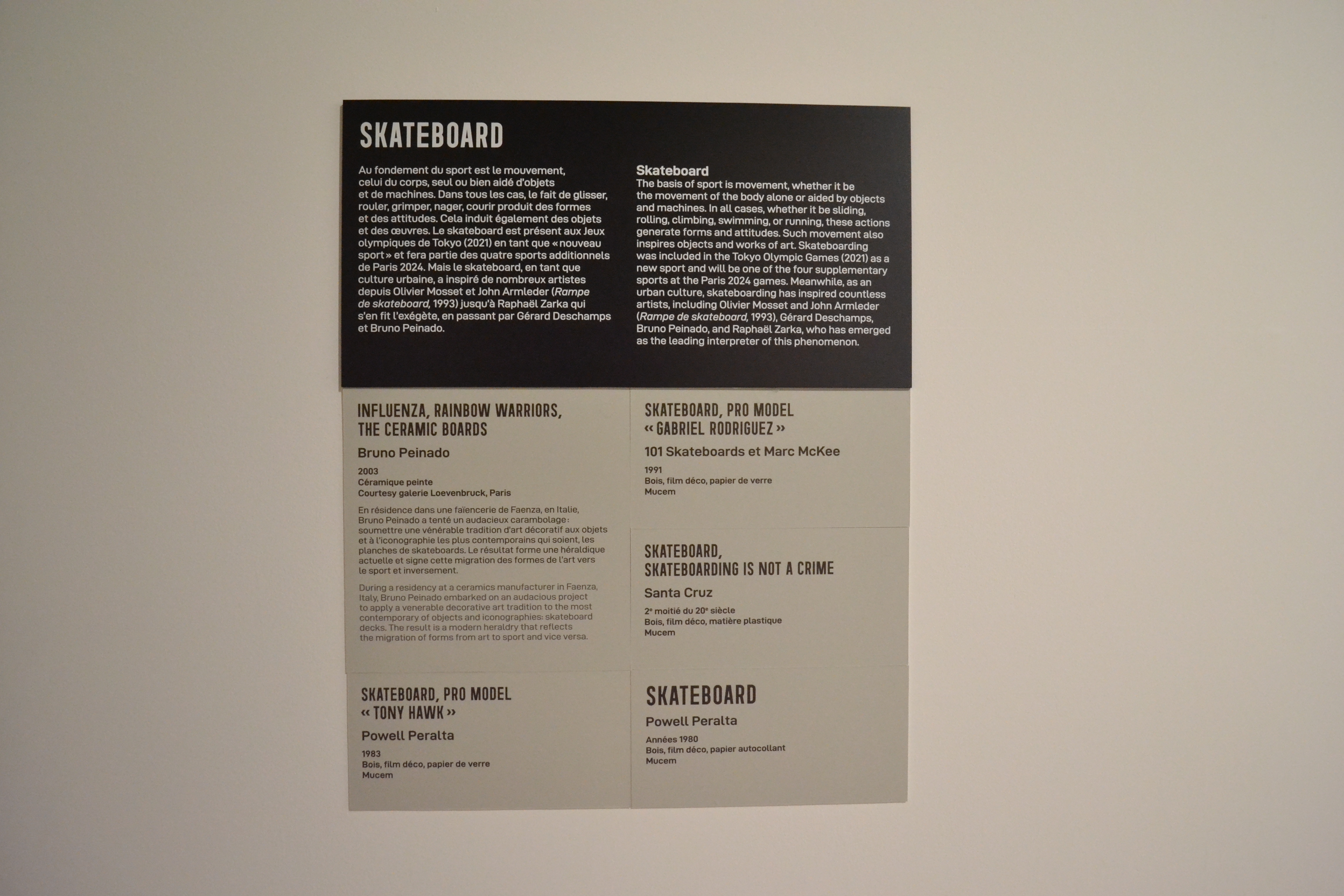 We created the signage for the Trophies and Relics exhibition based on the idea that the artefacts presented in the exhibition blur the line between works of art, vernacular objects, relics, etc. The signage supports this idea with lightness and finesse, using directional signage that anchors the space in the world of sport thanks to typography and panels inspired by sporting codes.