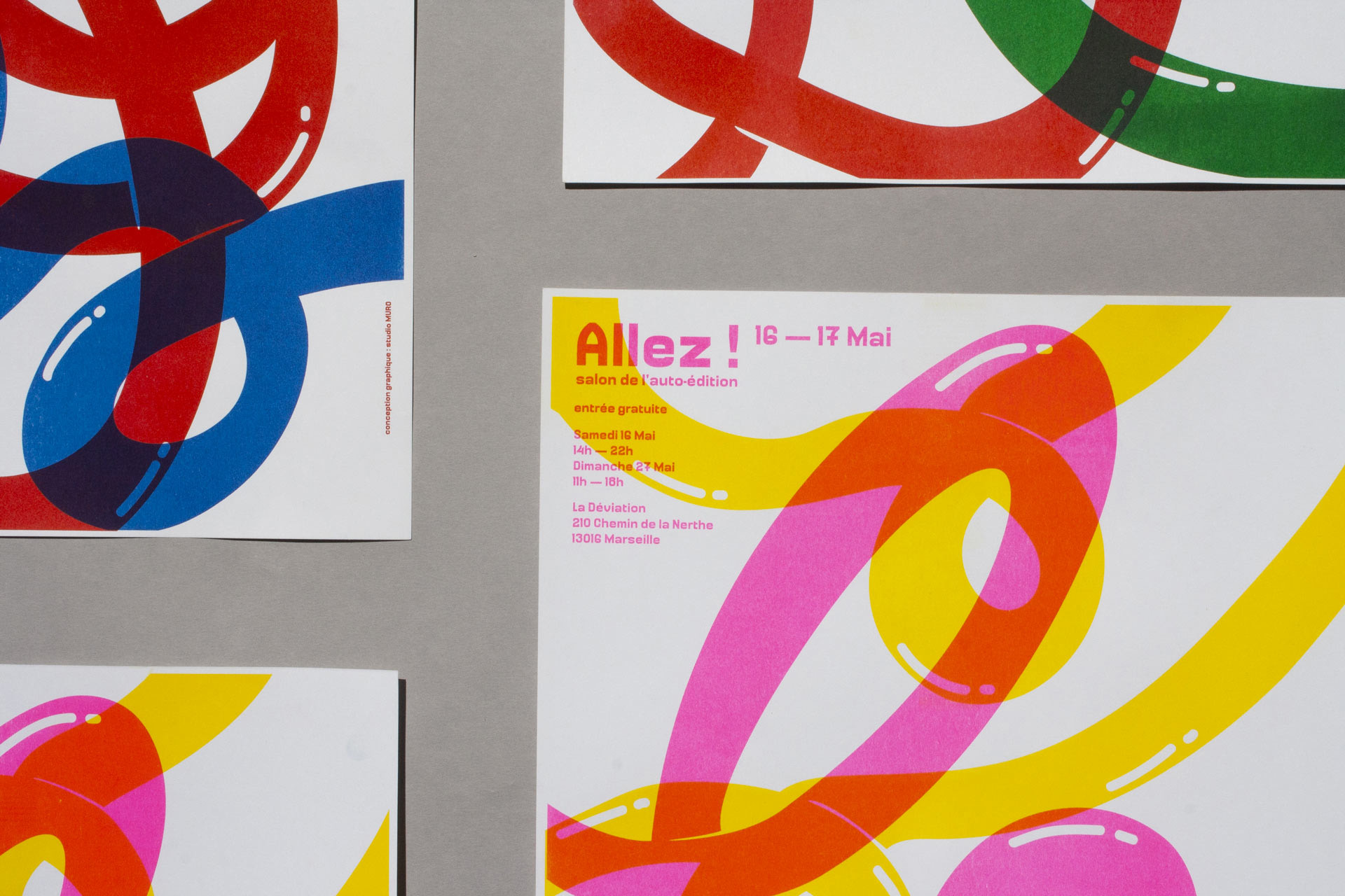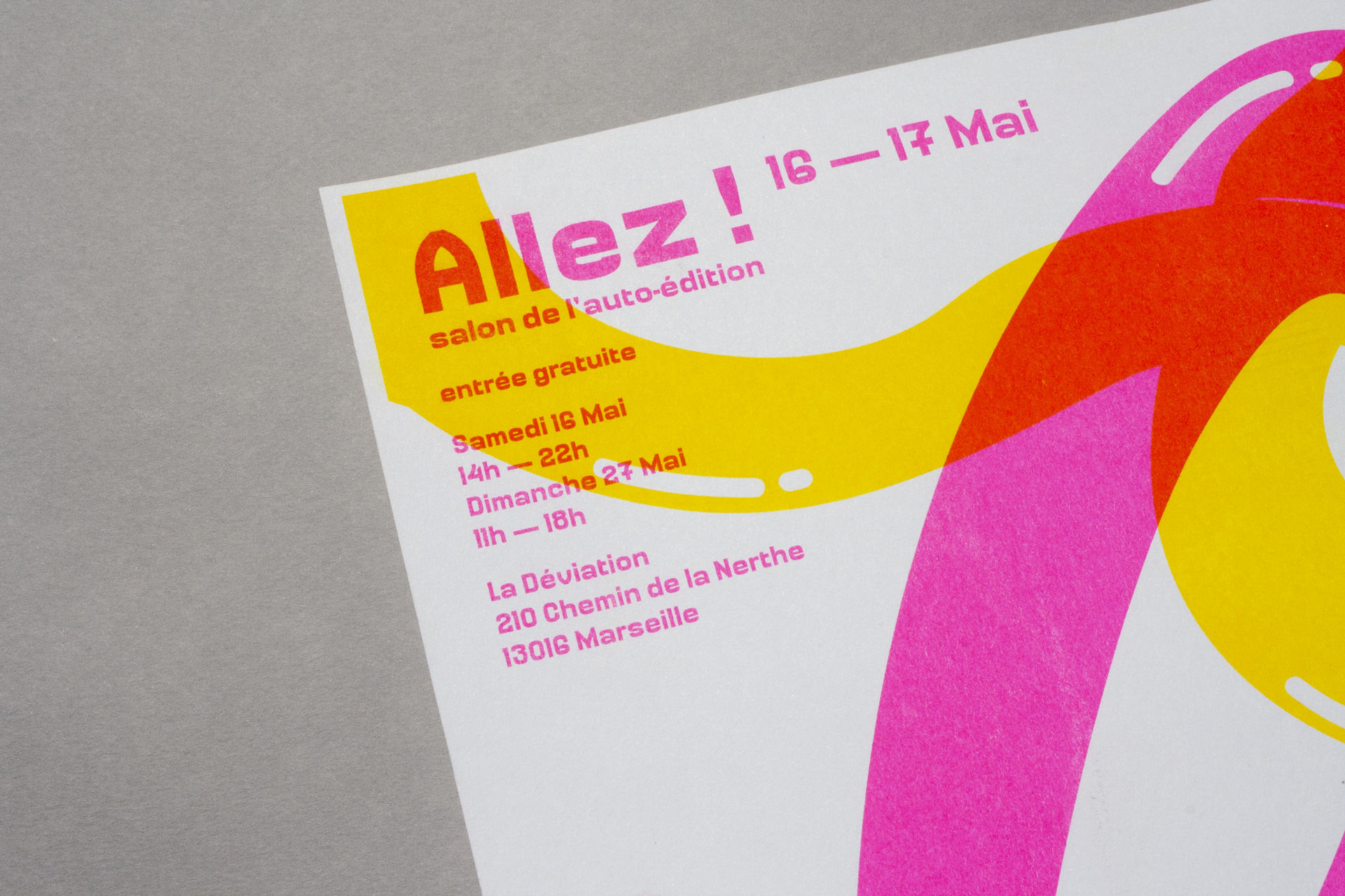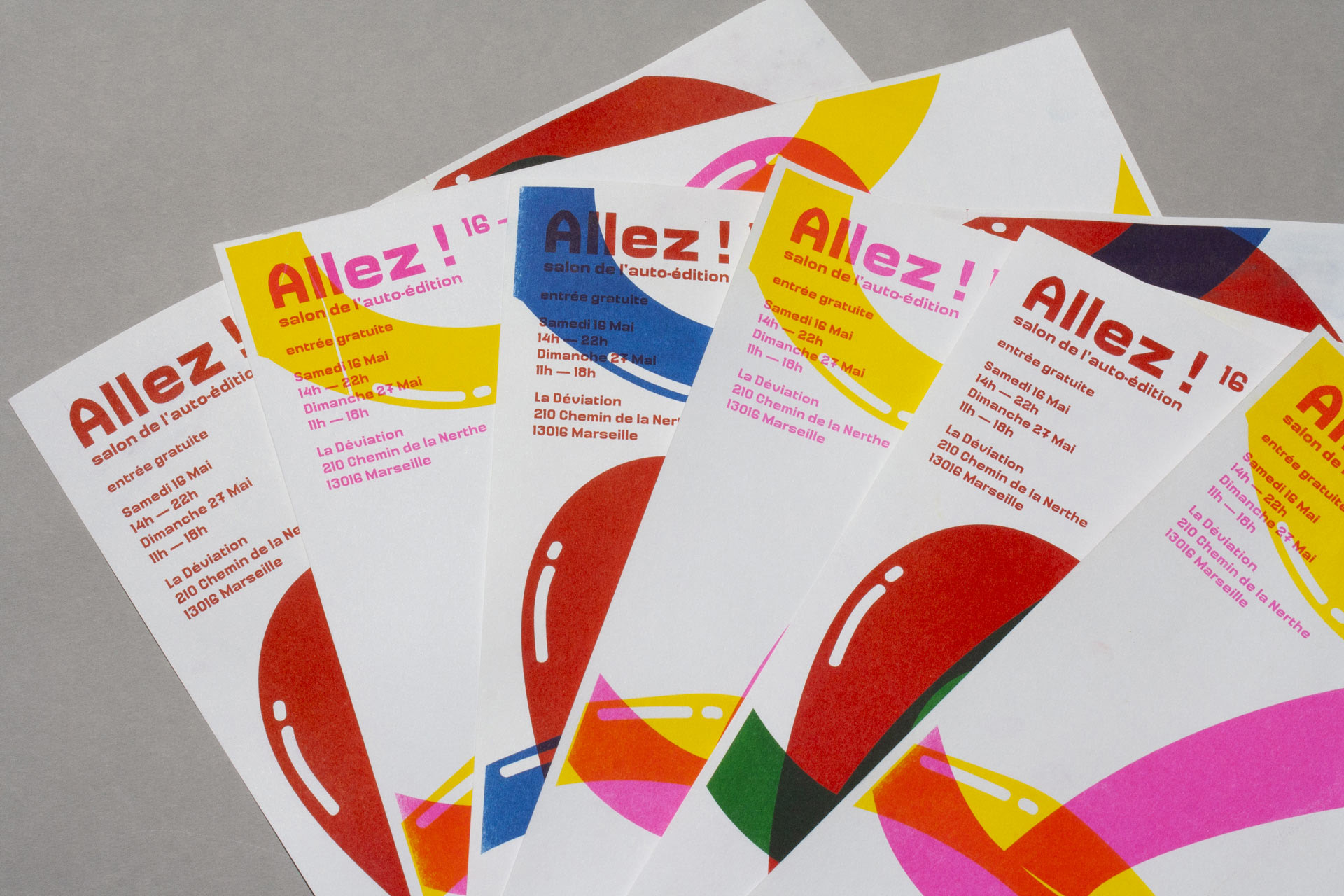 Conception et réalisation de l'identité graphique du Festival de l'auto-édition Allez ! organisé à La Déviation à l'Estaque, Marseille.