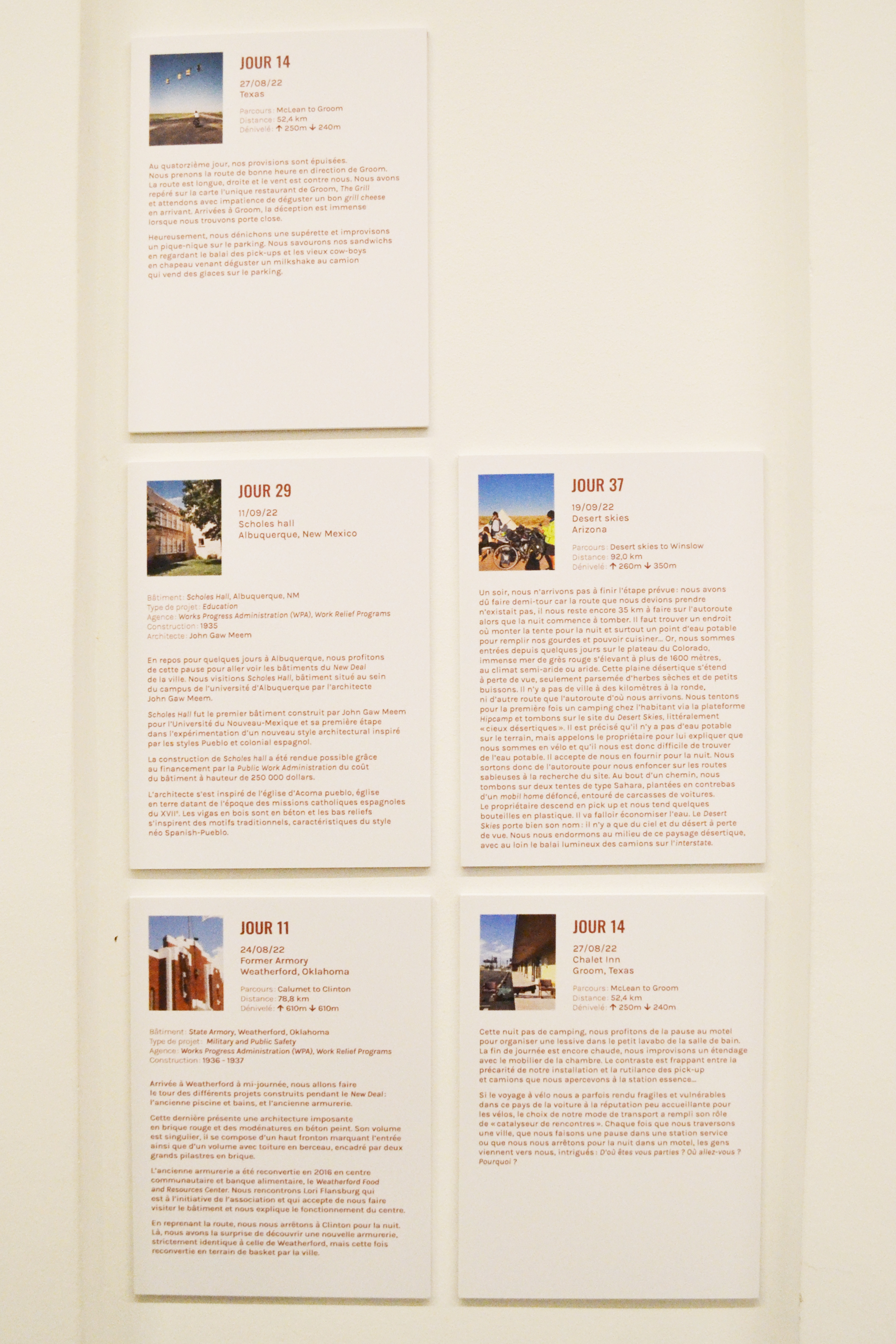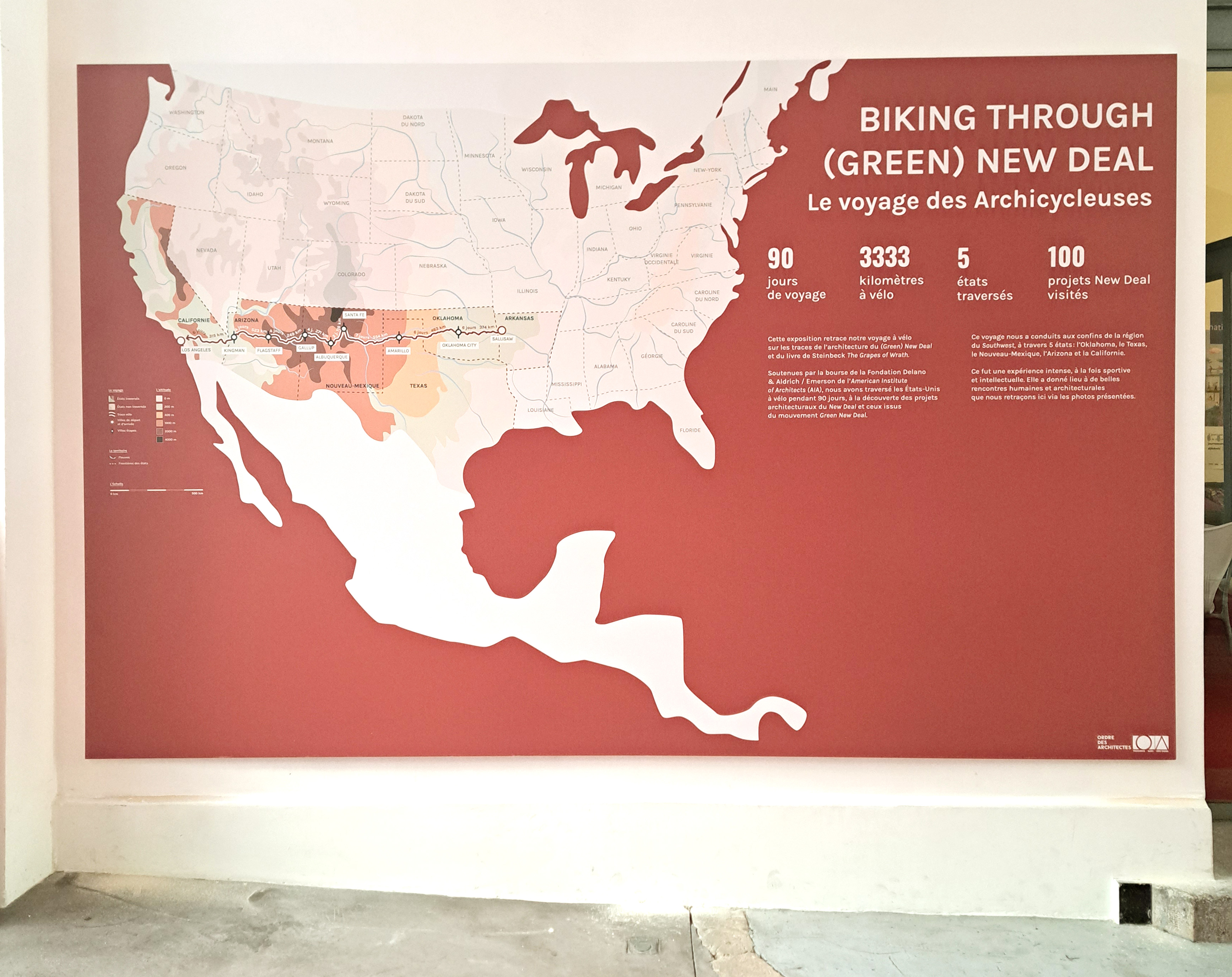 Elles proposent de lier la pratique architecturale au voyage en retraçant, à vélo, l’itinéraire du roman de John Steinbeck Les raisins de la colère, de l’Oklahoma à la Californie. Leur objectif est d’étudier les projets d’architecture issus du New Deal, ainsi que, plus récemment, ceux inspirés du Green New Deal.