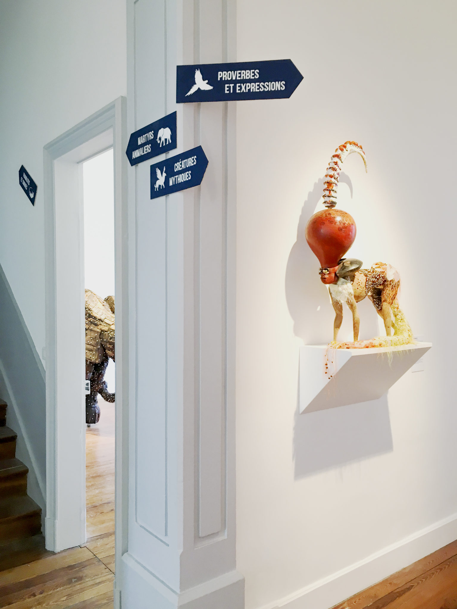 Pour accompagner cette exposition, nous avons conçu une signalétique riche en pictogrammes et motifs variés, créant un fil narratif qui raconte l’histoire des animaux à travers les œuvres présentées.