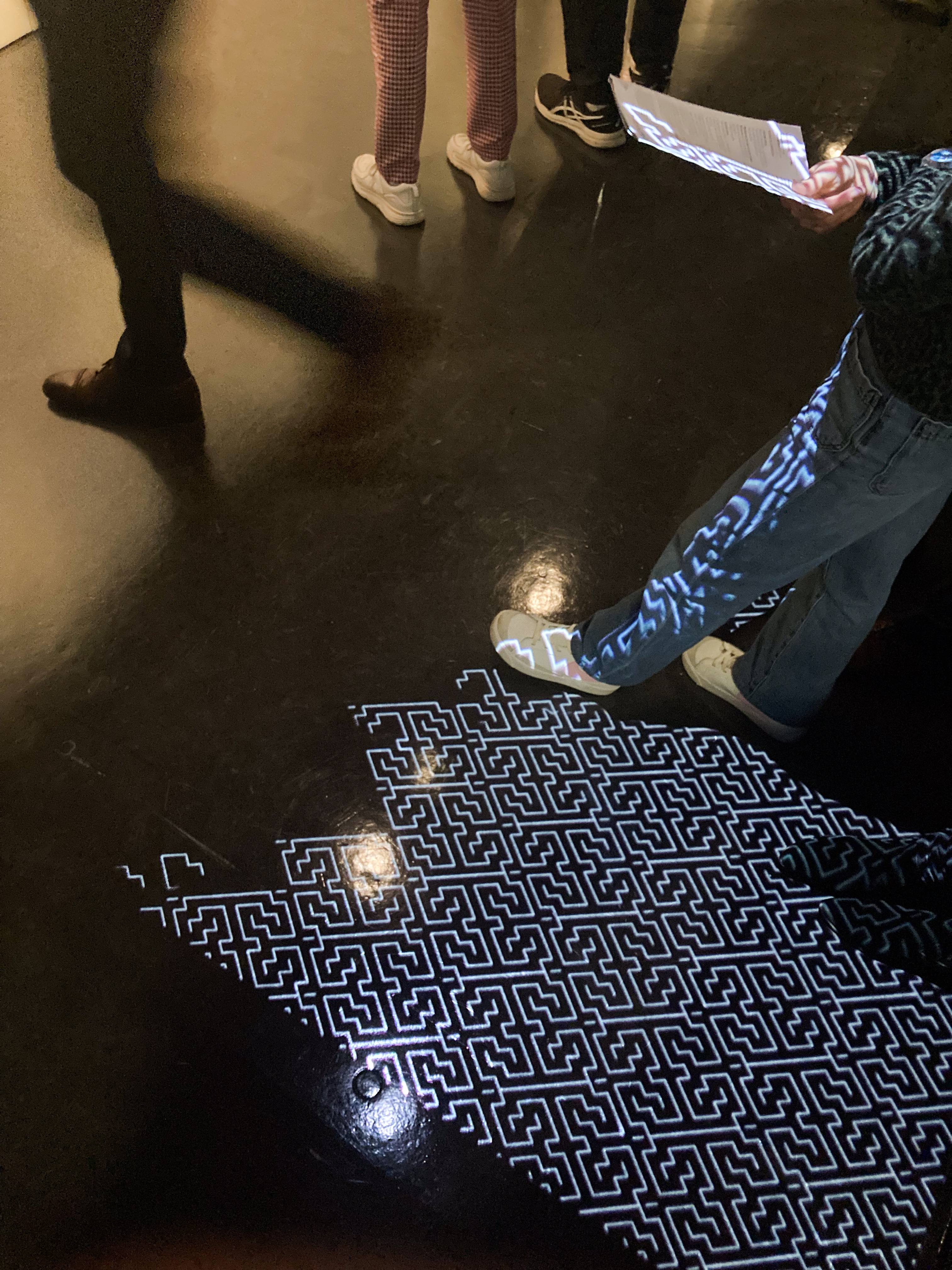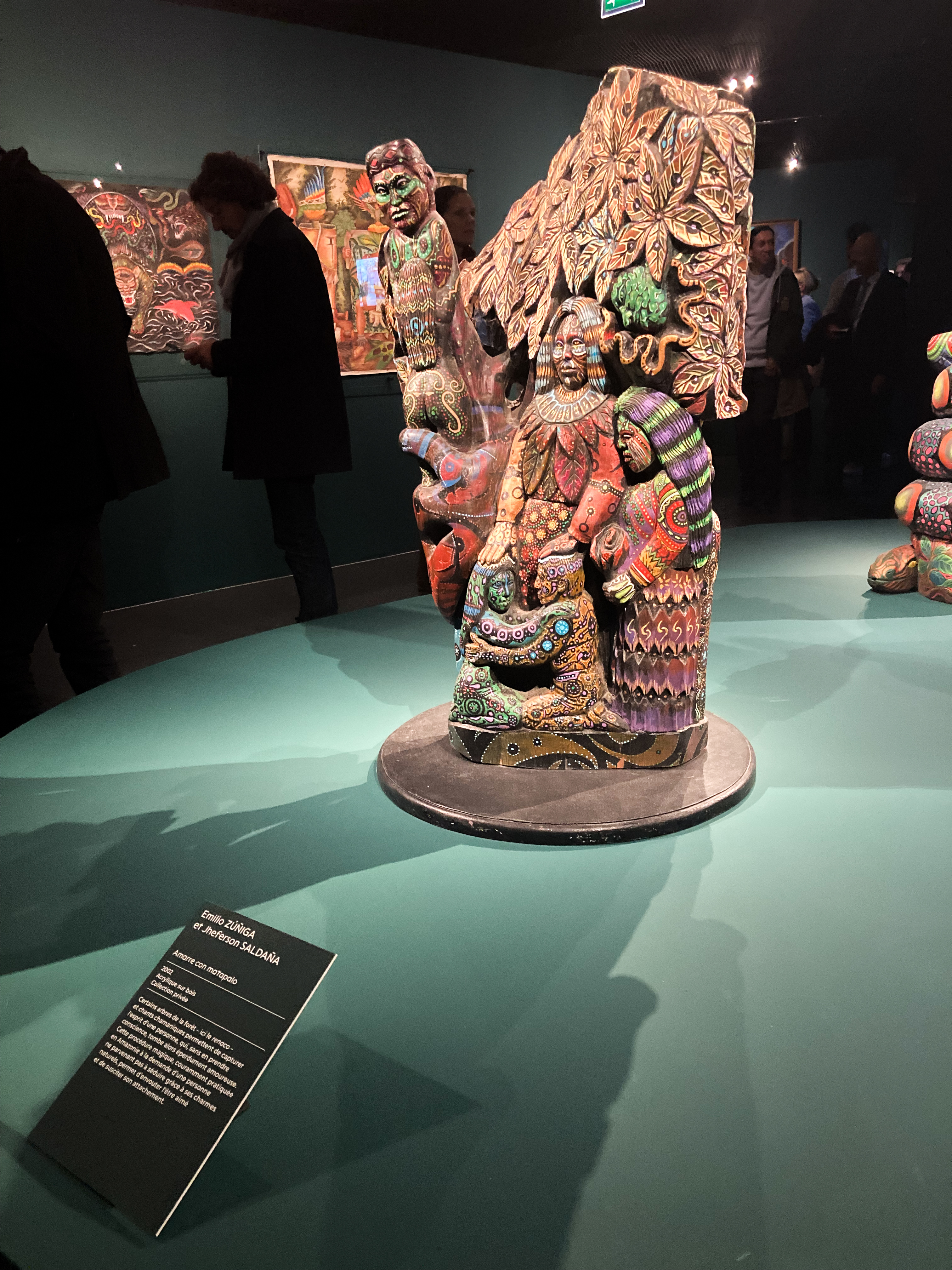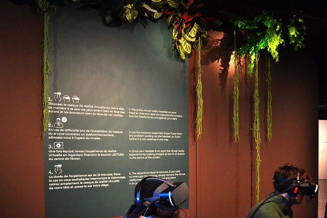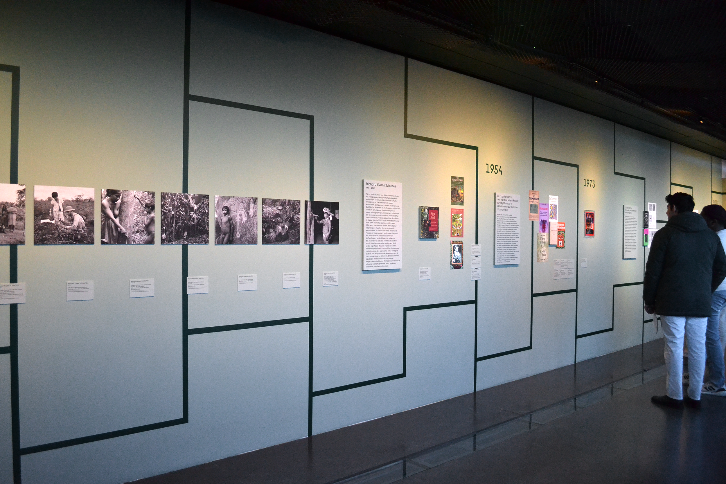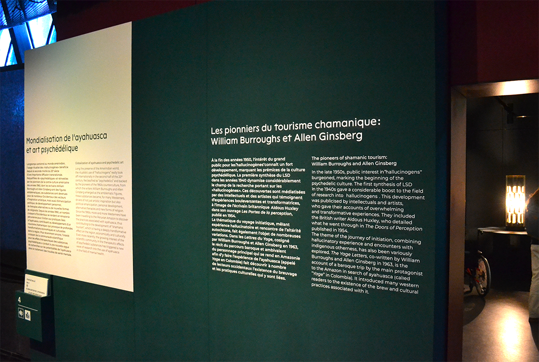 La signalétique s’harmonise avec ce propos en intégrant des dégradés diffus tout au long du parcours, évoquant des vapeurs ou des nuages, comme une métaphore des visions hallucinatoires. Les textes et certains fonds adoptent le vert profond de la forêt amazonienne, renforçant l’immersion sensorielle.