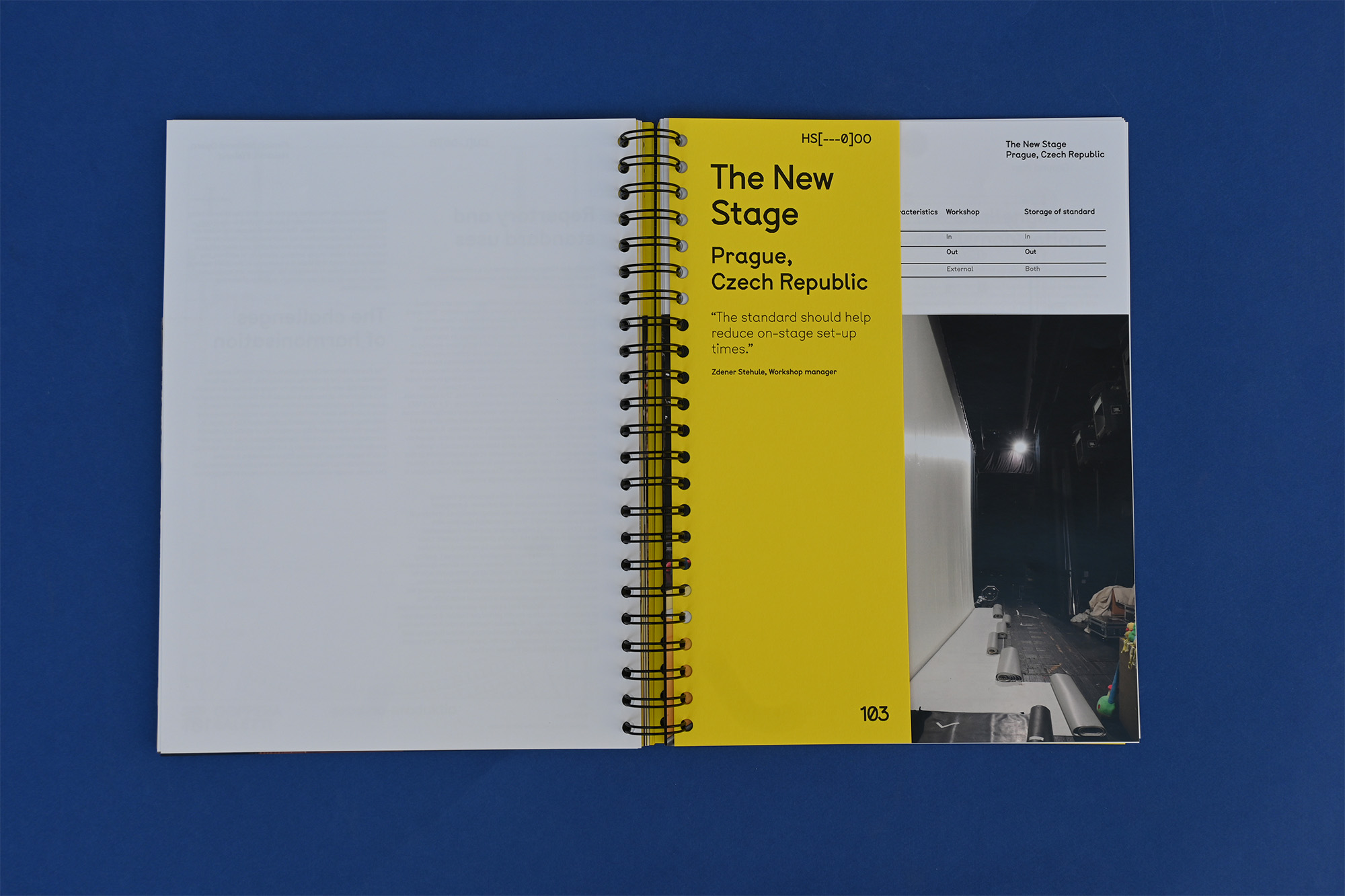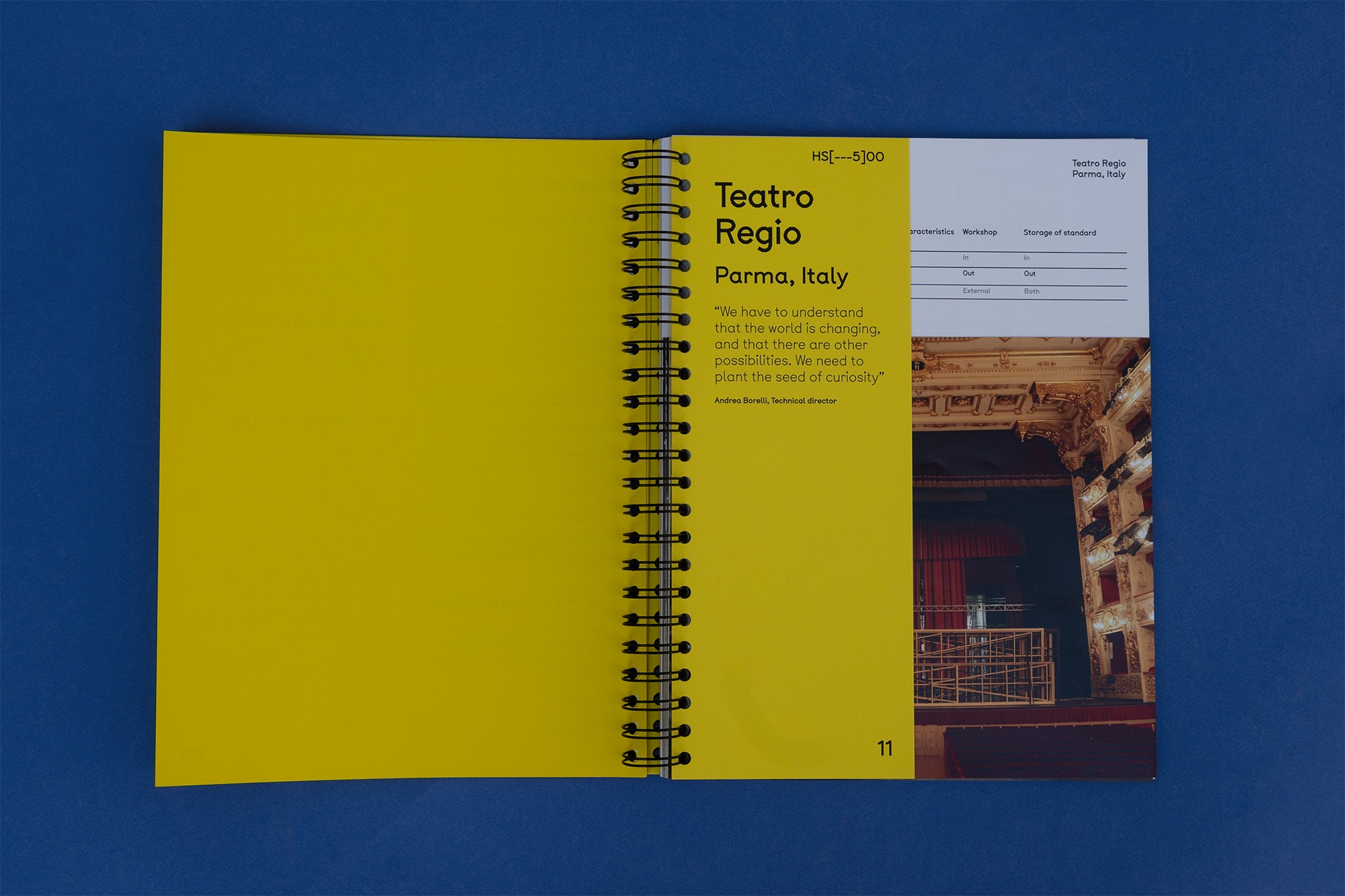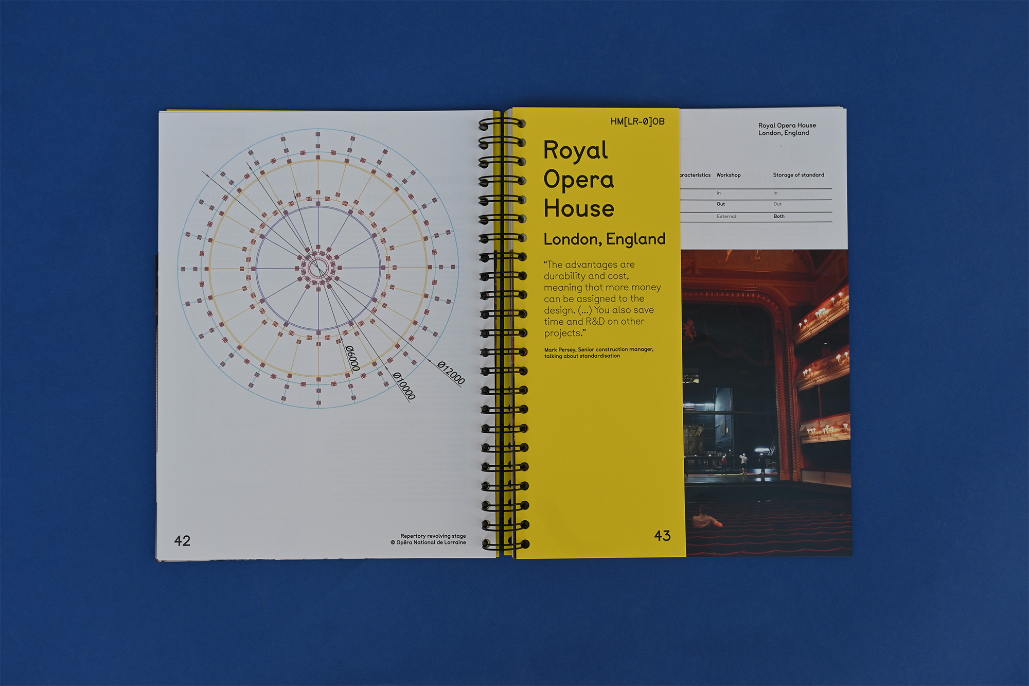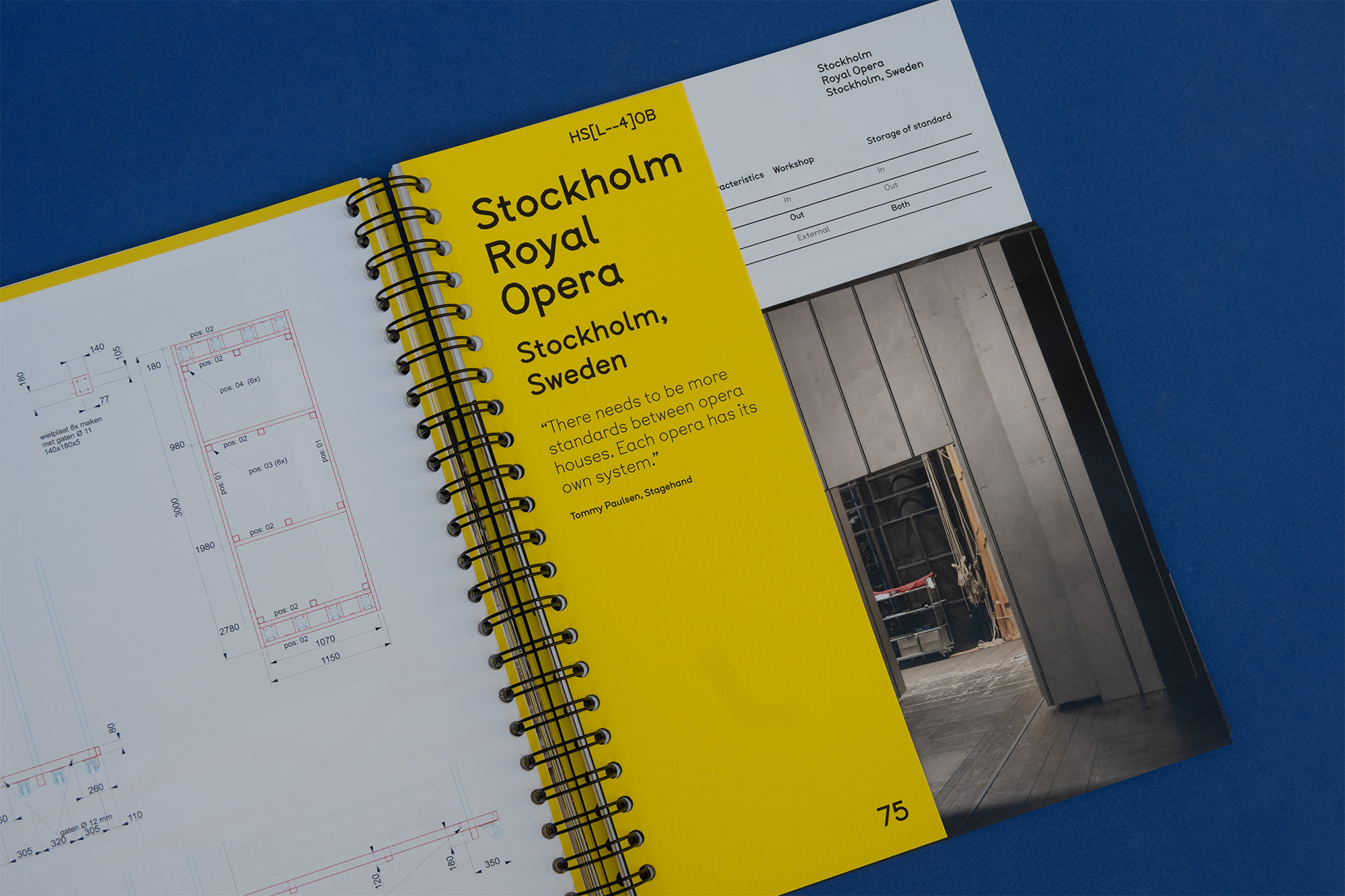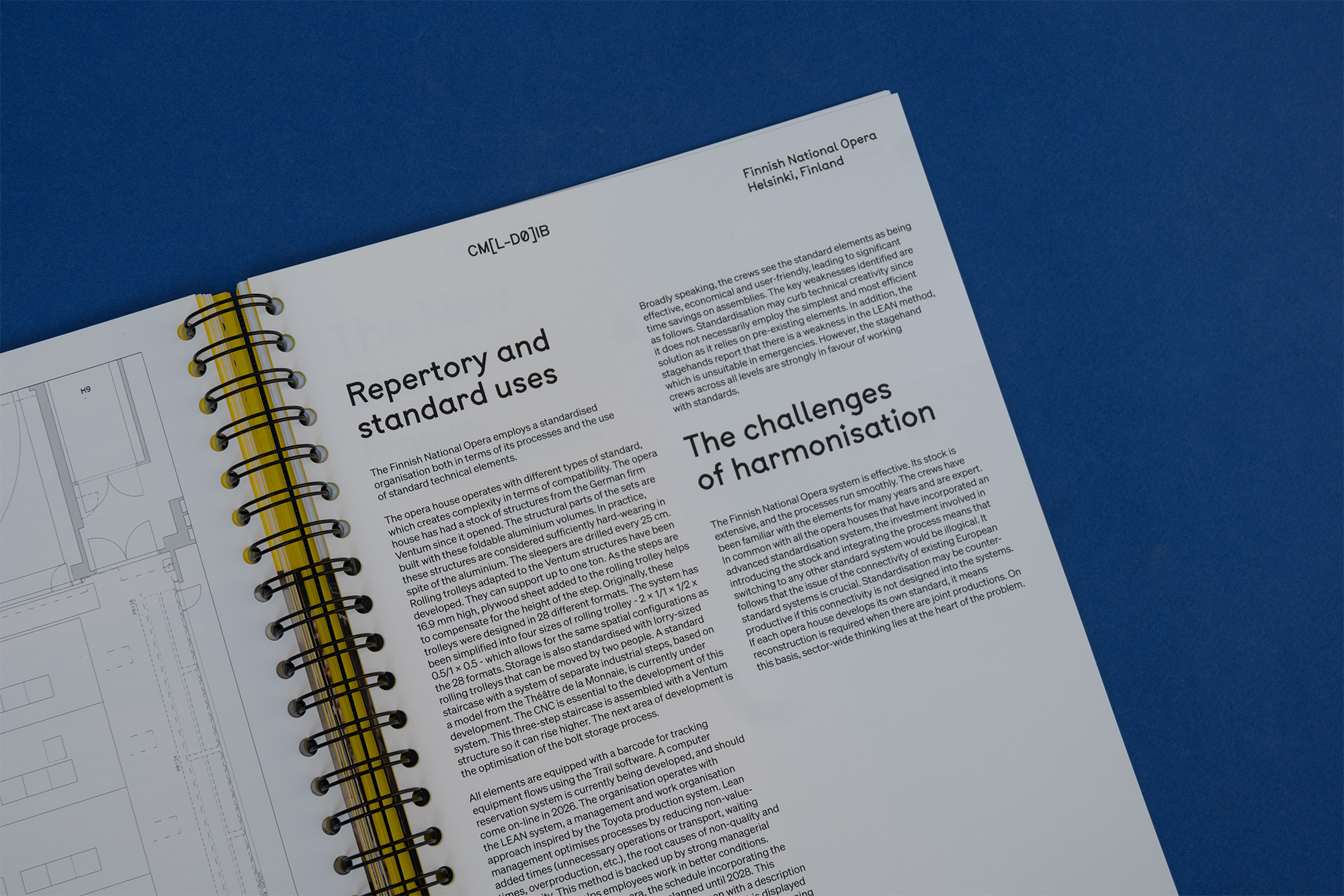 Le document technique est composé de 15 sections correspondant à chaque opéra. Les jeux de papiers de couleurs et de formats permettent de se repérer aisément entre descriptions, photographies et plans techniques.