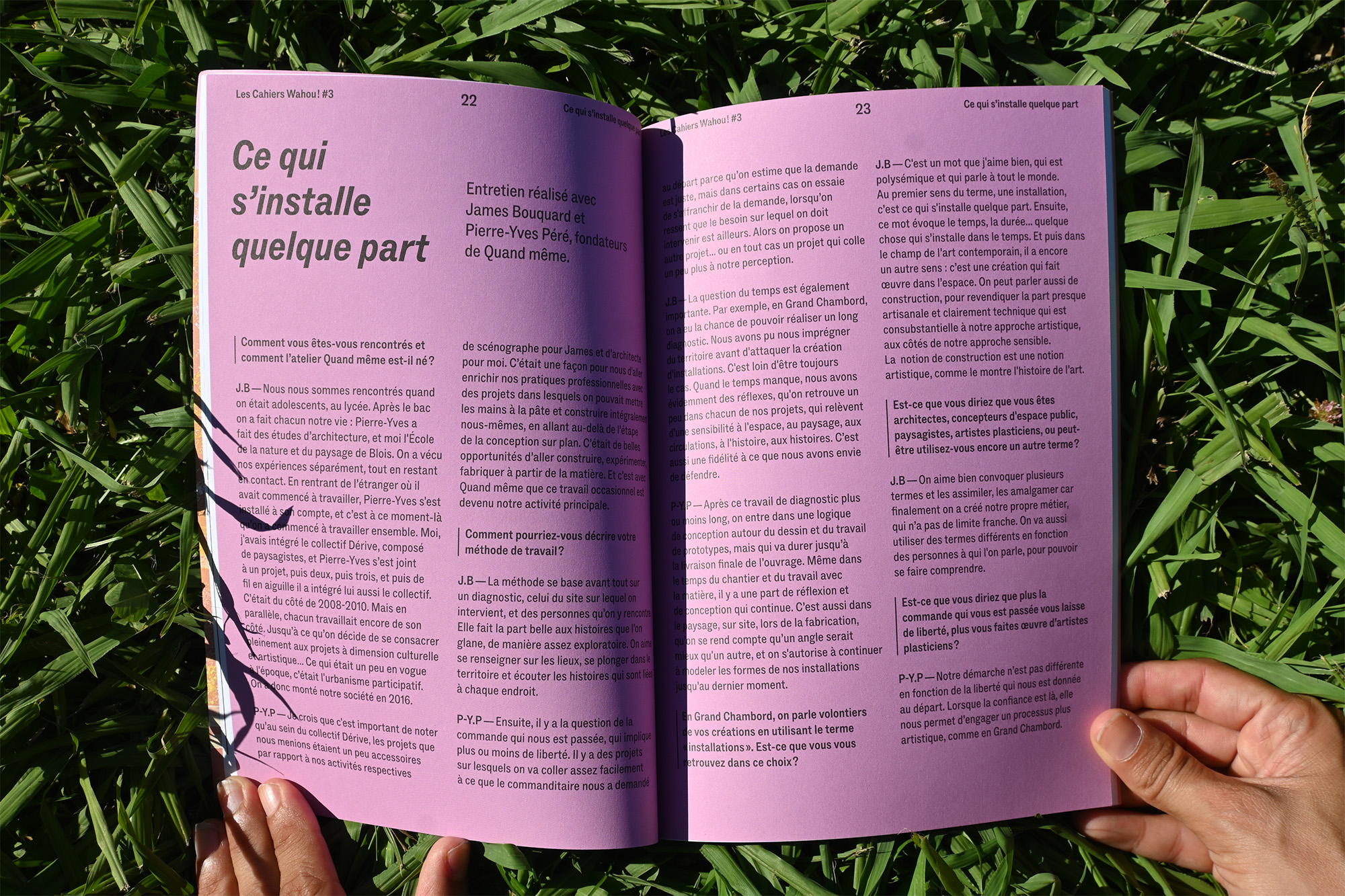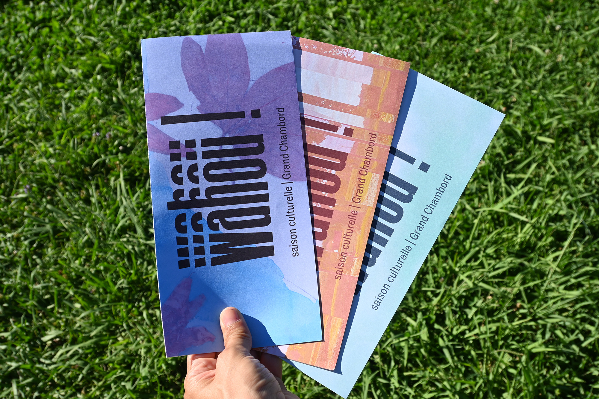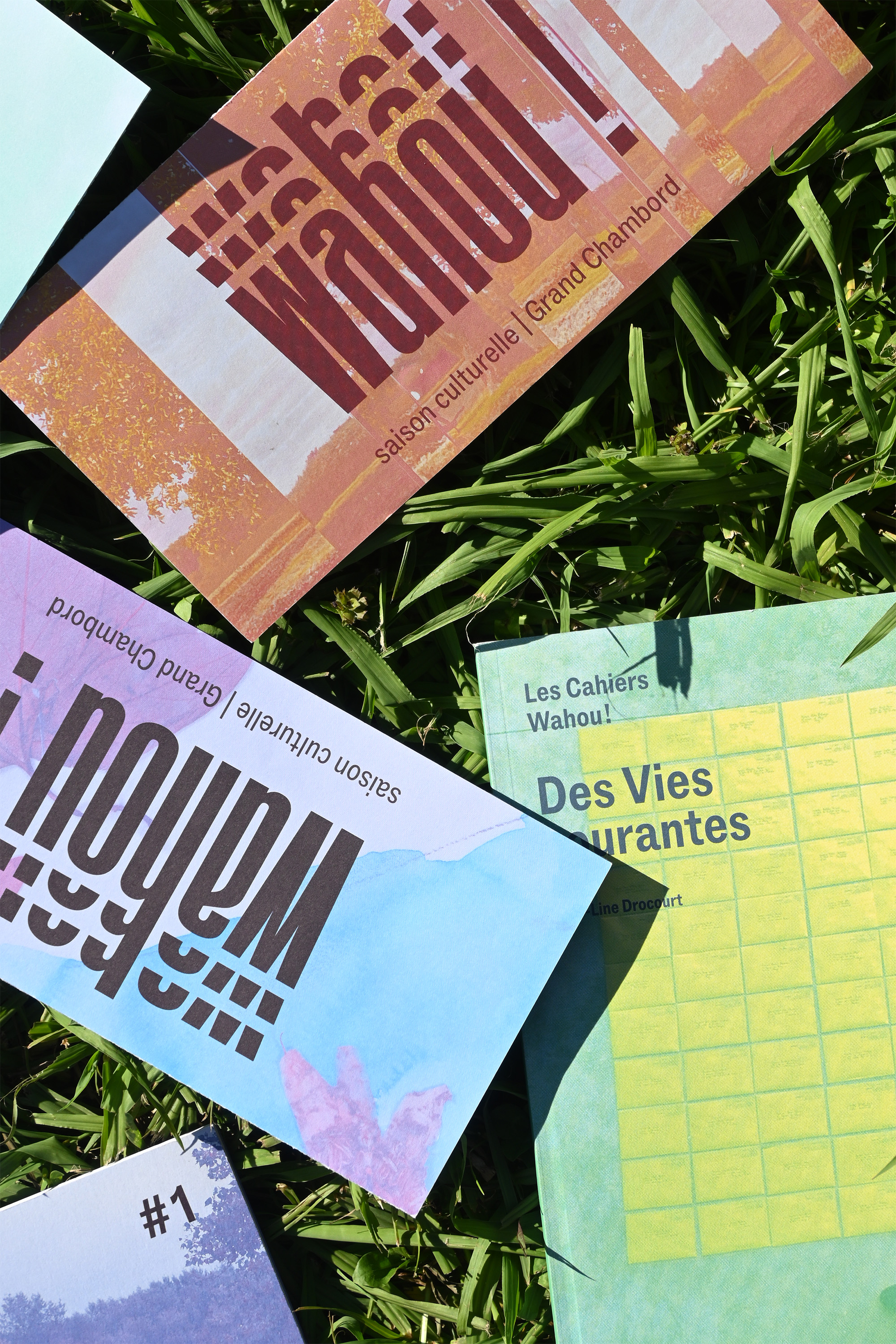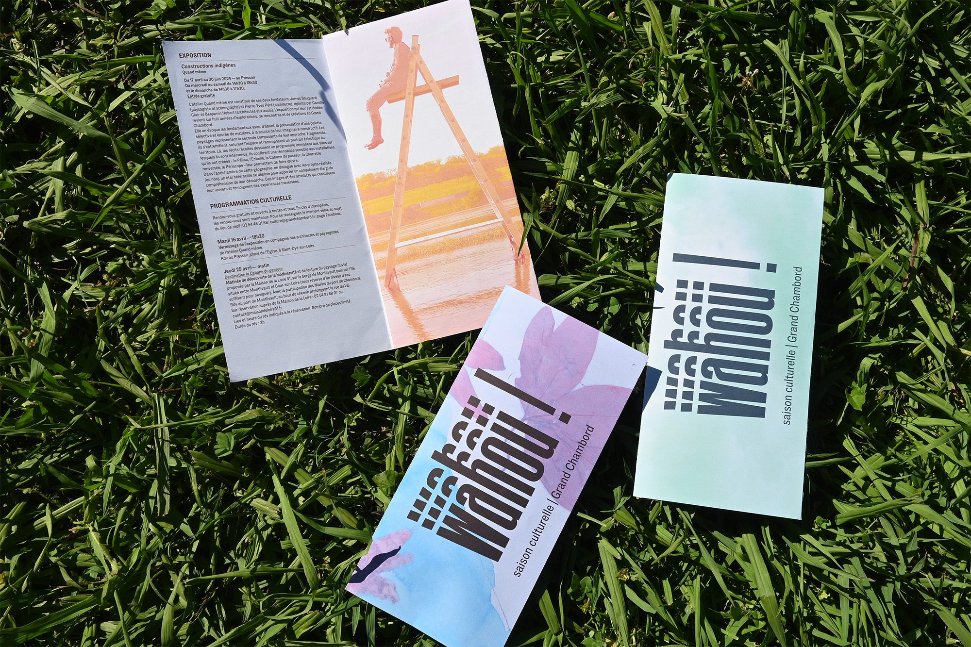 Notre mission comprend la conception et la réalisation de l’ensemble des supports de communication de la saison : affiche, invitation, dépliant de programmation, aide à la visite, ainsi que les Cahiers Wahou !, un catalogue d’exposition pensé comme un objet éditorial à part entière.
