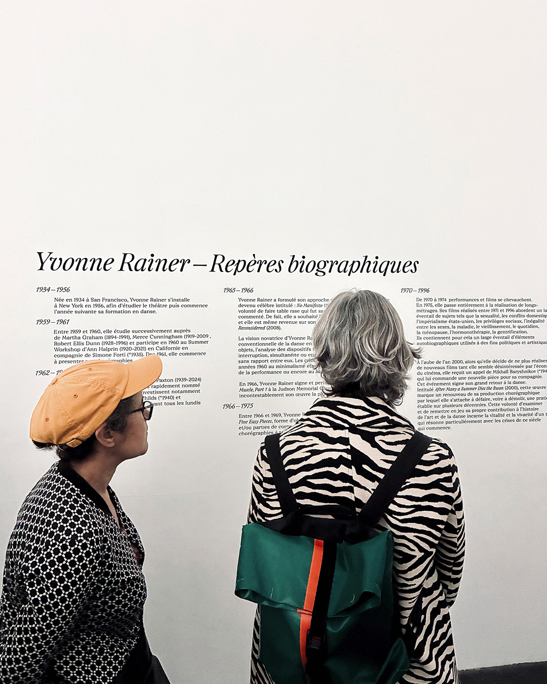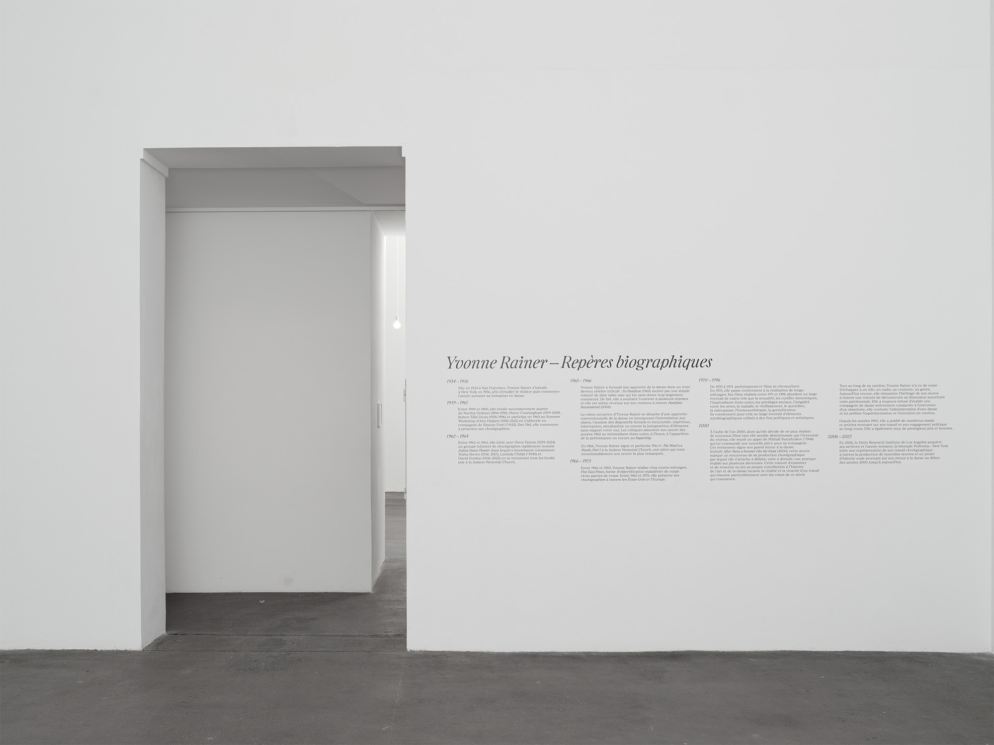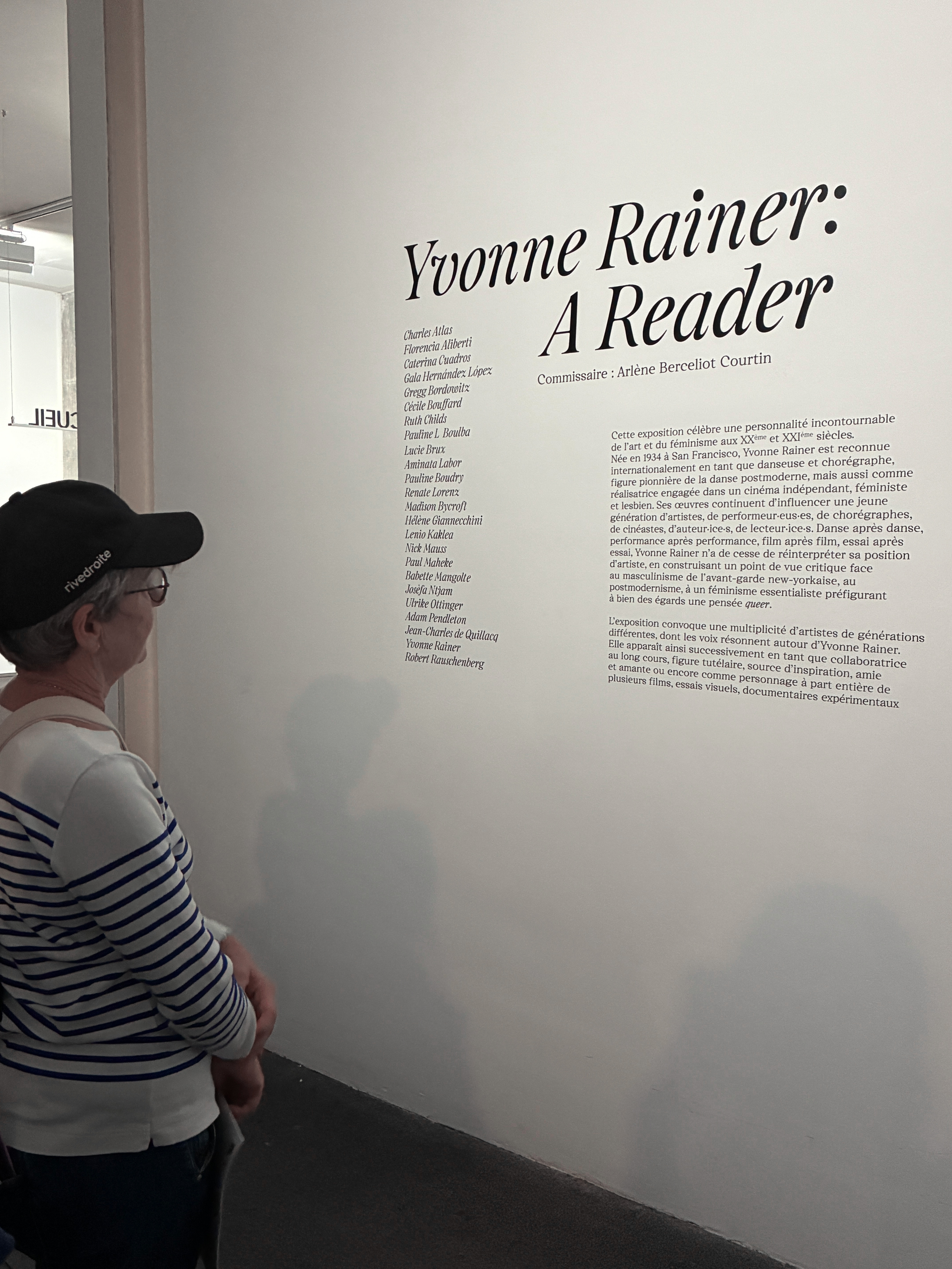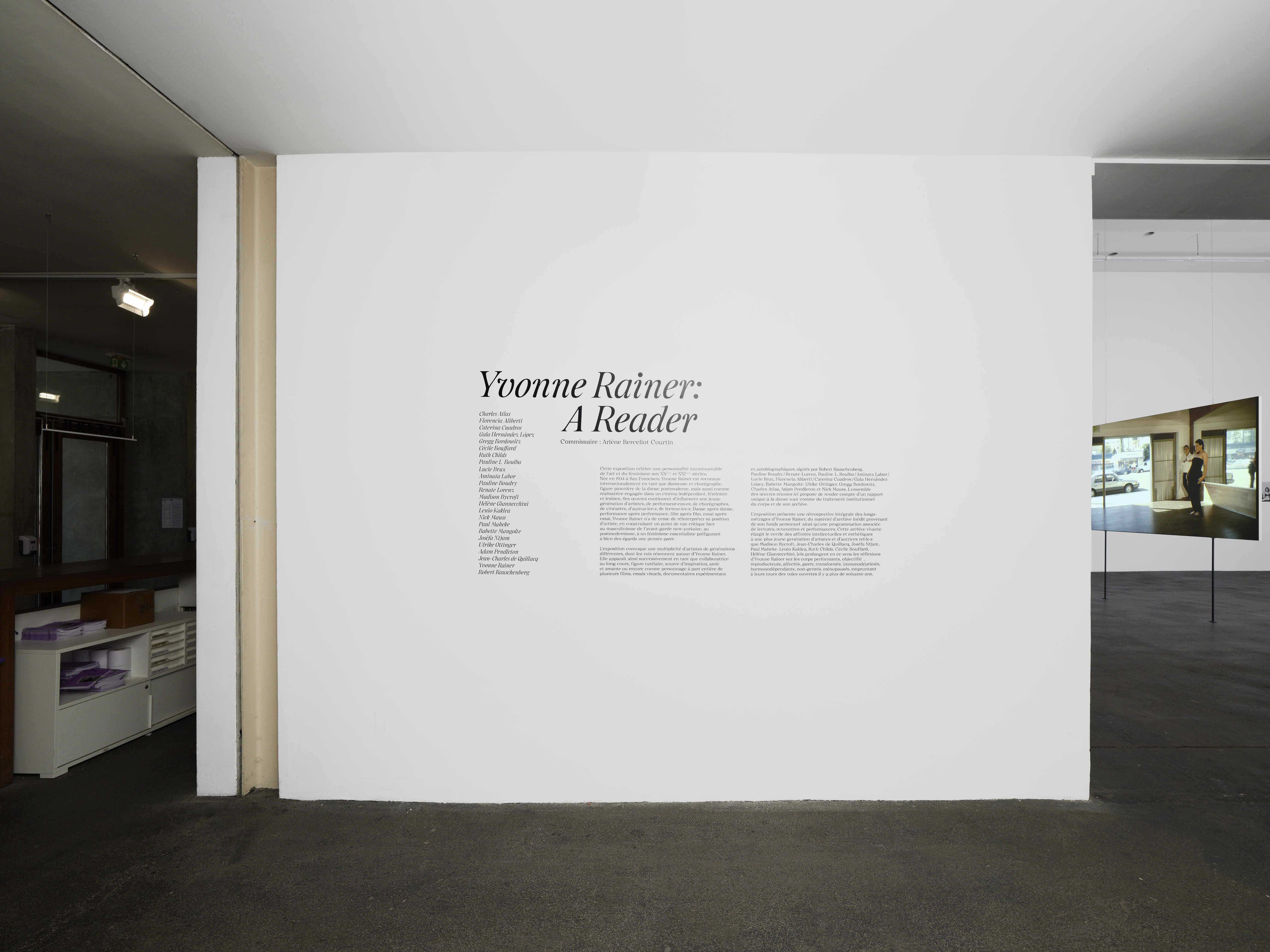 Tout en ayant l’apparence d’une monographie, cette exposition convoque une multiplicité d’artistes, performeur·euses, chercheur·euses, dont les voix résonnent autour d’Yvonne Rainer. L’exposition propose également une rétrospective intégrale des longs-métrages d’Yvonne Rainer, du matériel d’archive provenant de son fonds personnel et une programmation d’événements. Elle célèbre une personnalité incontournable de l’art et du féminisme aux 20e et 21e siècles.